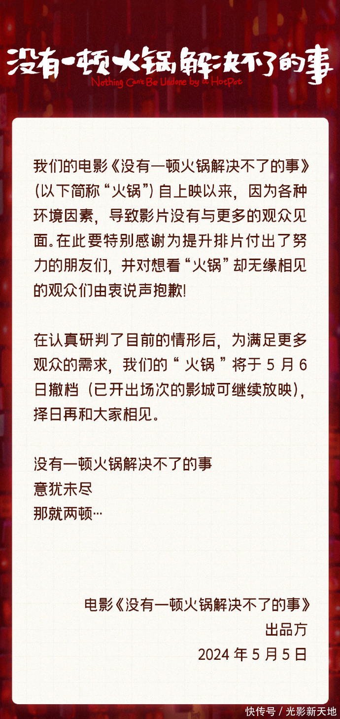5月5日中午,电影《莫得一顿暖锅贬责不了的事》(以下简称“暖锅”)官宣撤档。