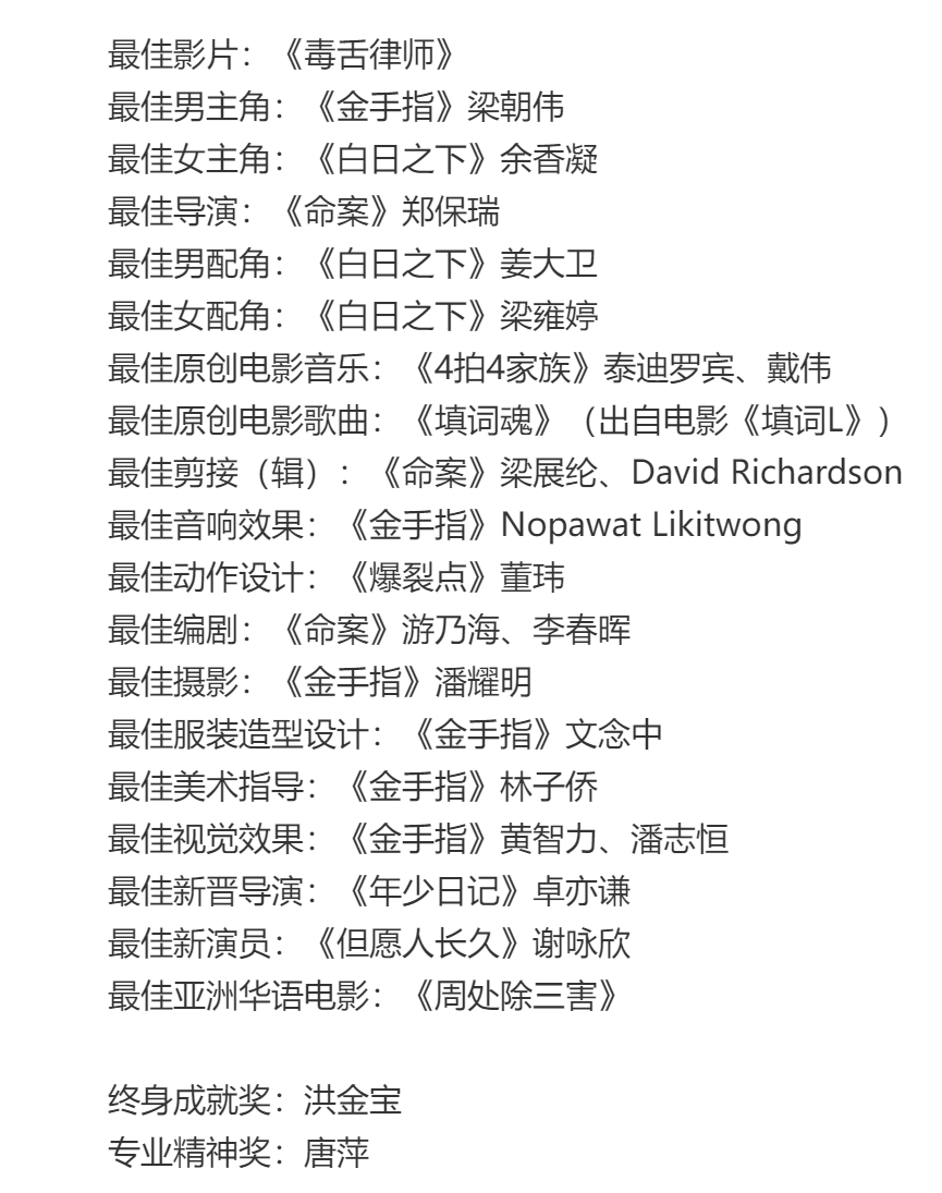 其中《金手指》拿到最好视觉限制、最好好意思术指导、最好造型贪图、最好照相、最好音响限制等本事奖项,梁朝伟孝敬最好男主角,亦然第六次拿到这个奖项。《命案》拿到最好编剧,最好编著、最好导演三项大奖,《周处除三害》拿到最好亚洲华语电影,可谓实至名归。
