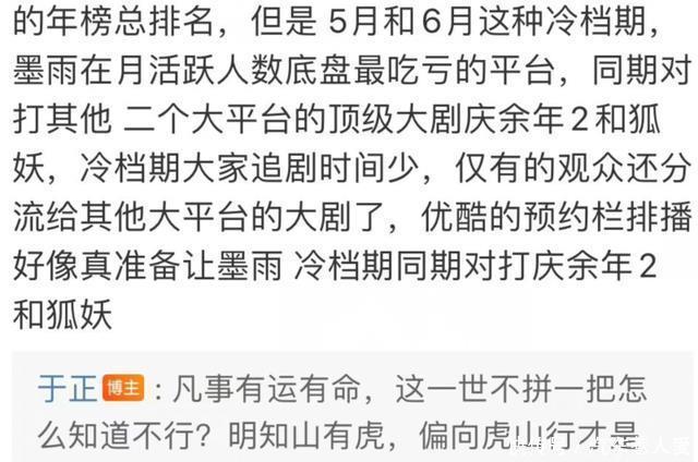 不少吴谨言的粉丝但愿于正能看清执行,不要与《庆余年2》还有《狐妖》硬碰硬,因为根底打不外,粉丝称《庆余年》的路东说念主盘太恐怖了,第一部的云合有用播放量集均是《延禧攻略》的2倍,致使远超《知否》《亲爱的可爱的》《狂飙》等剧,而时隔多年于正还莫得一部剧能与《延禧攻略》比好意思,加上《狐妖》又是大IP双流量主演,硬扛的话《墨雨云间》一定会亏损。